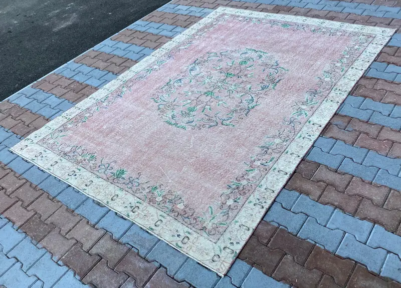 Eleganter rosa-blauer Teppich, 6,4 x 10 Fuß, floral und geometrisch