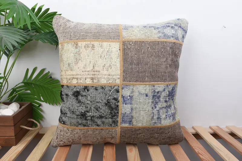 Blaues und braunes Patchwork-Wurfkissen, 22x22 besticktes Kissen