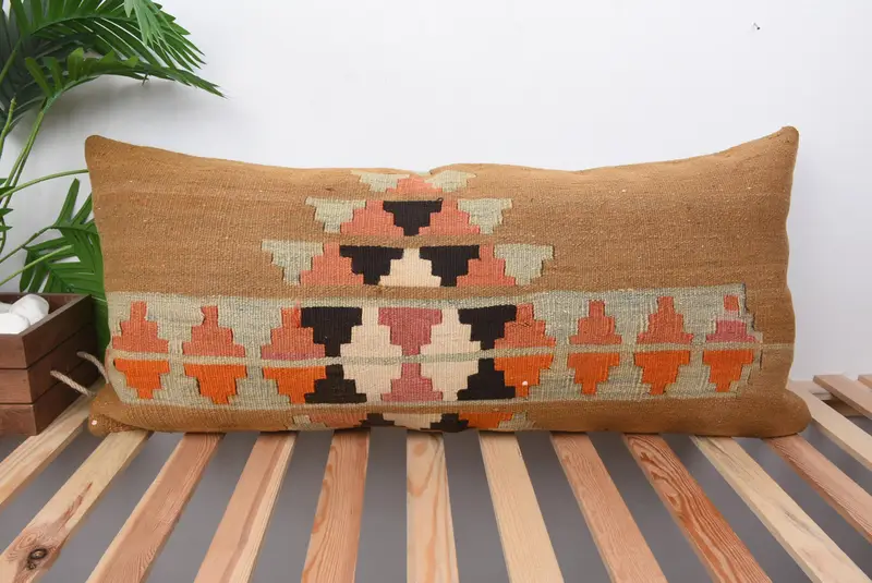 Braun & Orange besticktes Kissen, handgemachtes geometrisches Wurfkissen