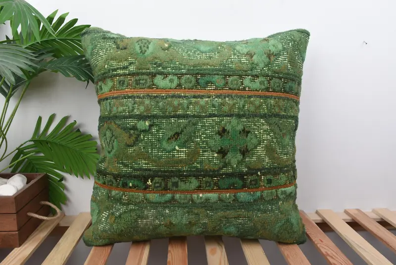 Handgefertigtes Patchwork-Wurfkissen in Grün und Braun, Vintage-gesticktes Kissen
