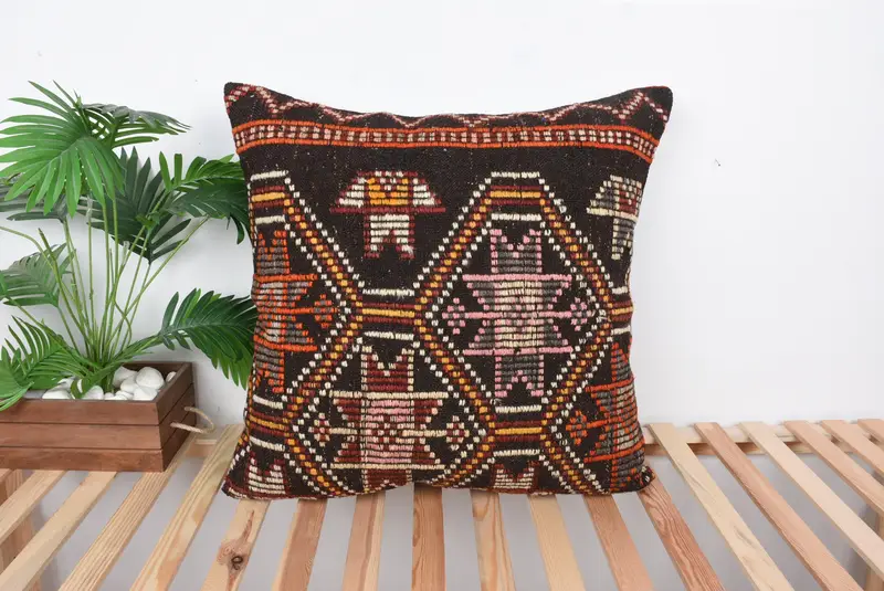 Geometrisches Kissen in Braun und Orange, Vintage-gesticktes Kissen