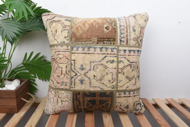 Beige & braunes Patchwork-Wurfkissen, besticktes Vintage-Kissen