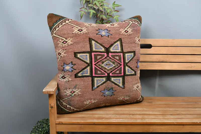 Geometrisches braun & rosa besticktes Kissen, handgemachtes Wurfkissen
