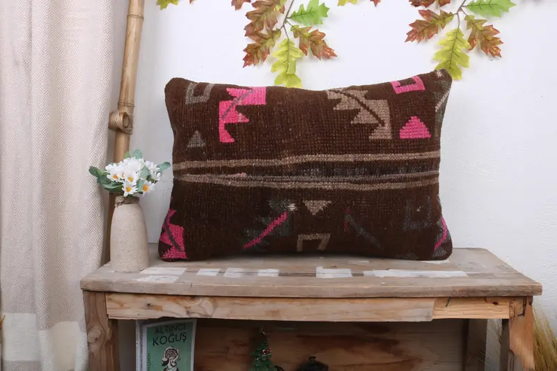 Braun & Rosa besticktes Wurfkissen, 16x24 handgemachtes Patchworkkissen