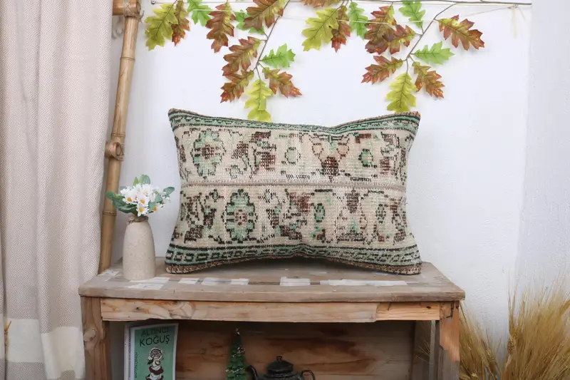 Beige-grünes Blumen-Wurfkissen, handgefertigtes Kissen aus Leinen und Wolle