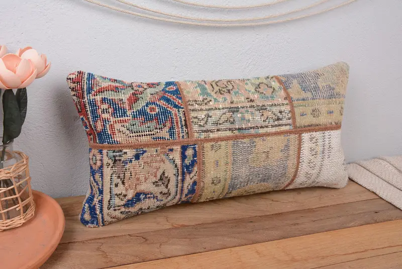 Blaues Patchwork-Kissen, handgefertigtes besticktes Kissen