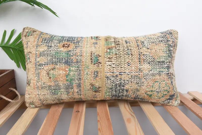 Blaues und orangefarbenes Patchwork-Wurfkissen, besticktes Vintage-Kissen