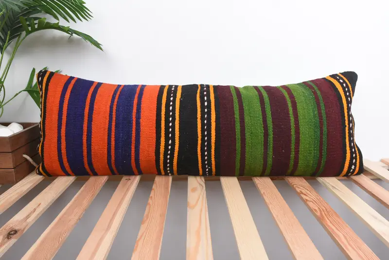 Orange & grün gestreiftes Kissen, handgefertigtes besticktes Kissen