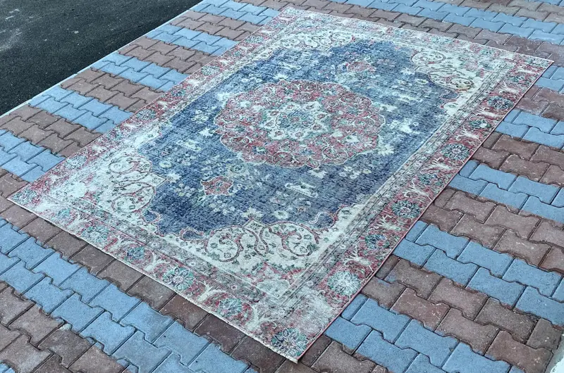Blauer Teppich mit Blumen- und geometrischem Muster, 6,5 x 9,1 Fuß