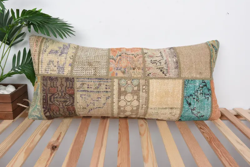 Beige & Braun besticktes Kissen, handgemachtes Patchwork-Wurfkissen