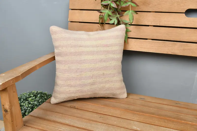 Besticktes beige & rosa gestreiftes Kissen, handgemachtes Vintage-Wurfkissen
