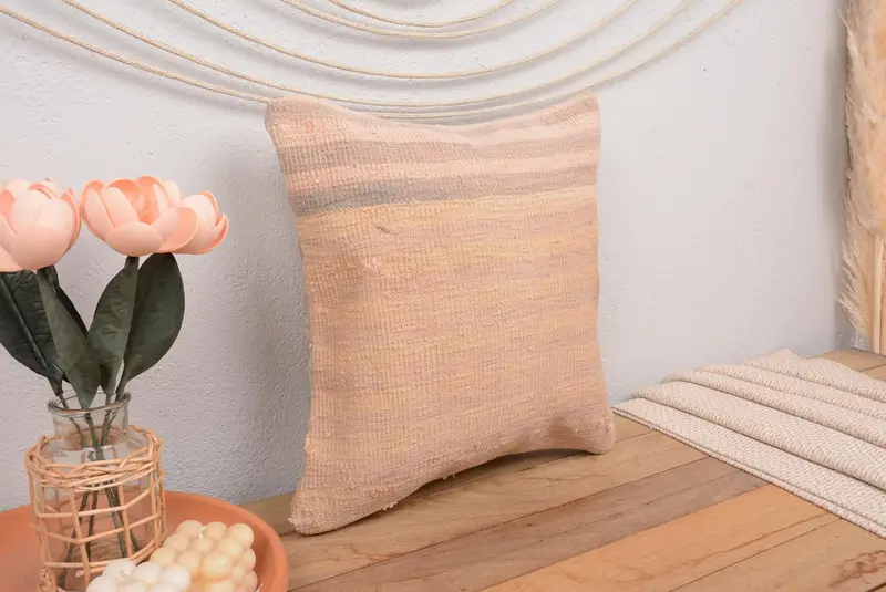 Gesticktes rosa & beige gestreiftes Kissen, handgefertigtes Vintage-Wurfkissen