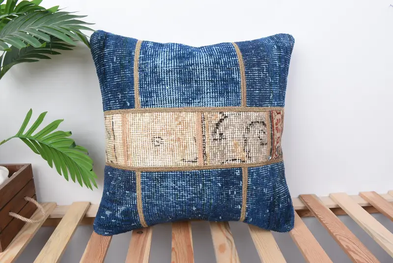 Besticktes Patchwork-Wurfkissen in Blau und Beige, handgefertigtes Kissen