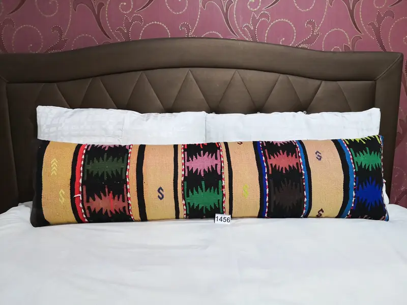 Handgefertigtes beige-grün gestreiftes Wollkissen, 12 x 48 Zoll großes rechteckiges Kissen