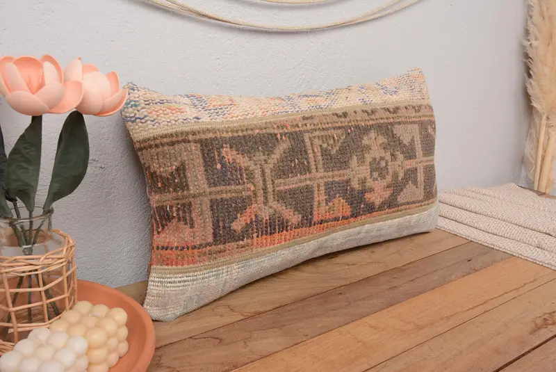 Braunes & oranges geometrisches Rechteckkissen, handgemachtes Wurfkissen