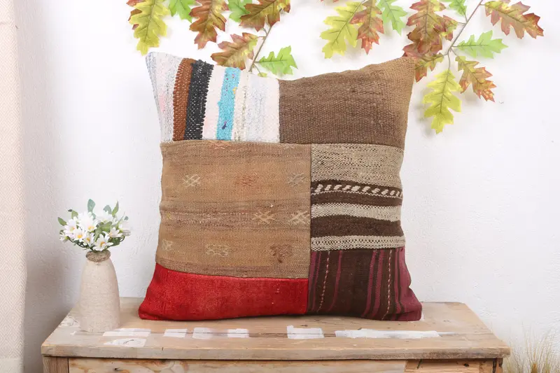 Braunes und beiges Patchwork-Wurfkissen, 22x22 besticktes Kissen