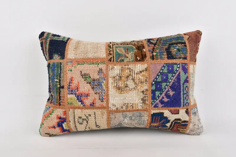 Blaues und braunes Patchwork-Wurfkissen, handgefertigtes besticktes Kissen