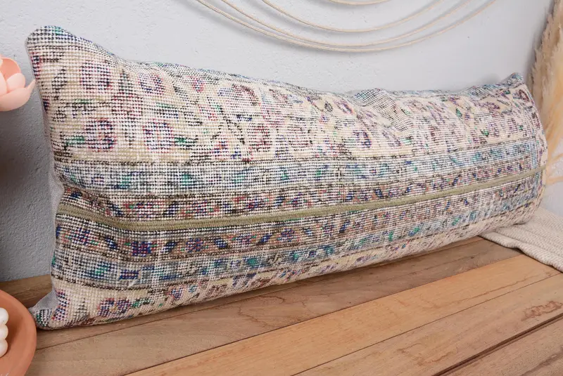 Besticktes Patchwork-Kissen in Beige und Bronze, handgefertigtes rechteckiges Wurfkissen