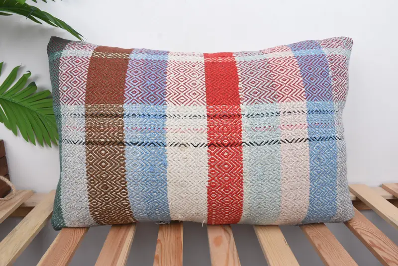 Blau-rot gestreiftes Kissen, besticktes Vintage-Kissen