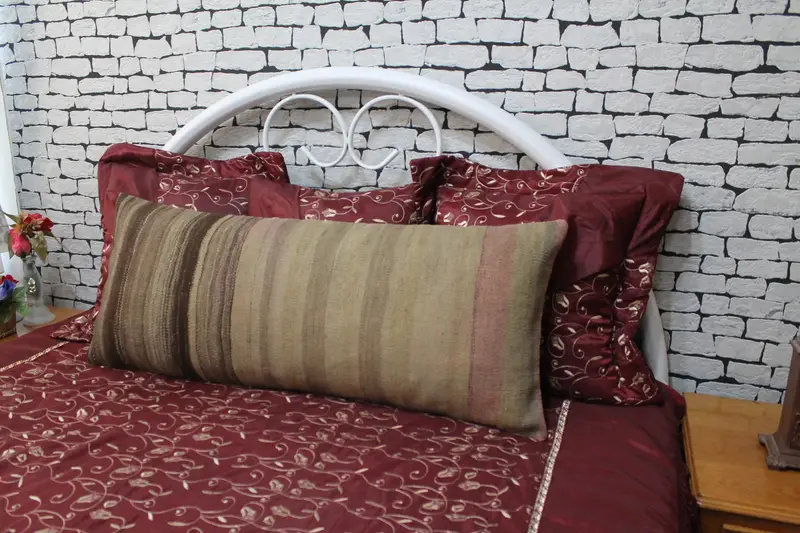 Gesticktes rechteckiges Kissen, braun-grau gestreiftes Wurfkissen