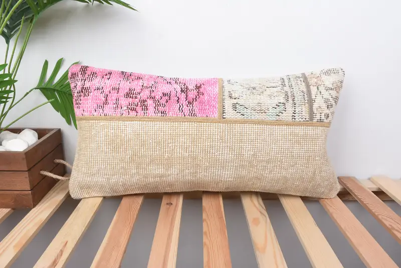 Handgefertigtes besticktes Patchwork-Kissen, Vintage-Beige- und Rosa-Wurfkissen