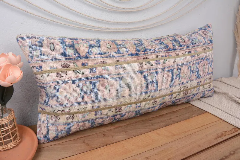 Blaues und beiges rechteckiges Patchwork-Wurfkissen, Vintage-gesticktes Kissen