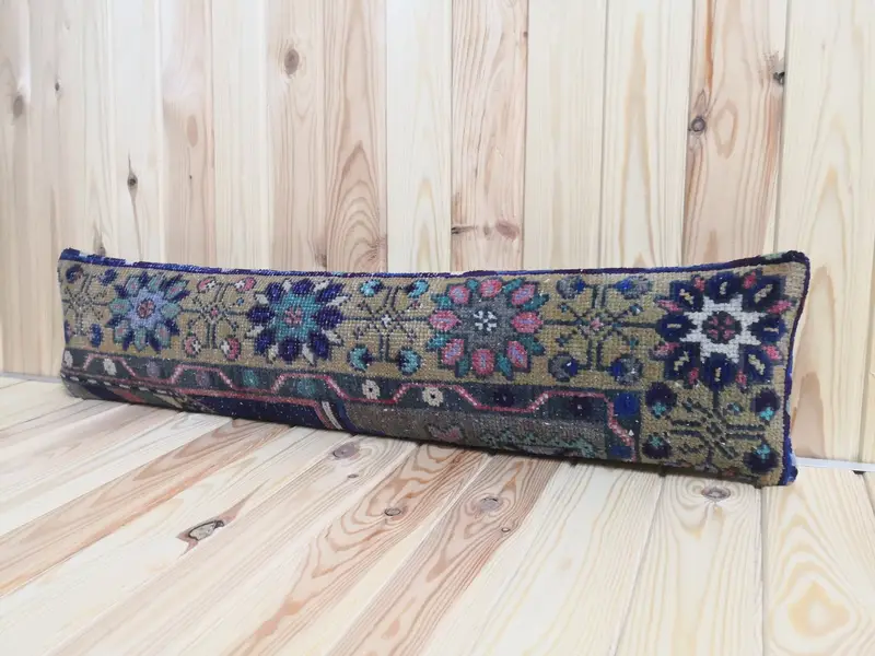 Handgefertigtes besticktes Wollkissen, blaues und grünes rechteckiges Blumenkissen