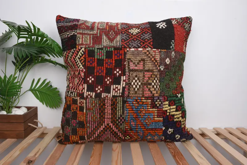 Gesticktes braunes und rotes Patchwork-Wurfkissen, Vintage-Kissen