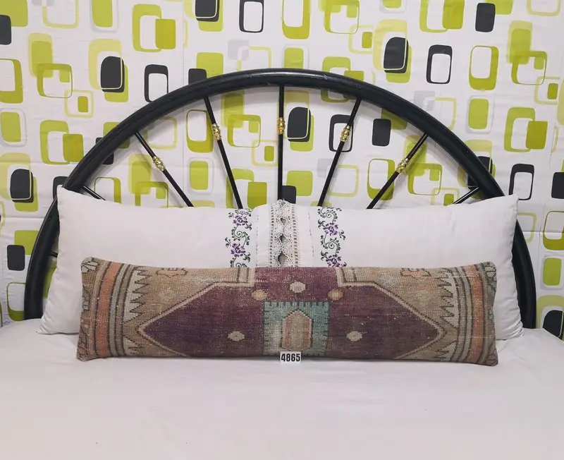 Handgefertigtes Wollkissen, braunes und lila geometrisches Rechteckkissen