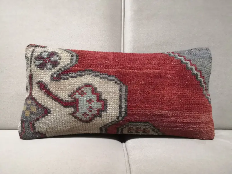 Handgefertigtes geometrisches Wollkissen in Rot und Grau, rechteckiges Vintage-Kissen
