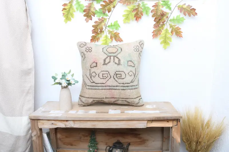 Handgefertigtes Beige & Braunes Blumenkissen, Vintage besticktes Kissen