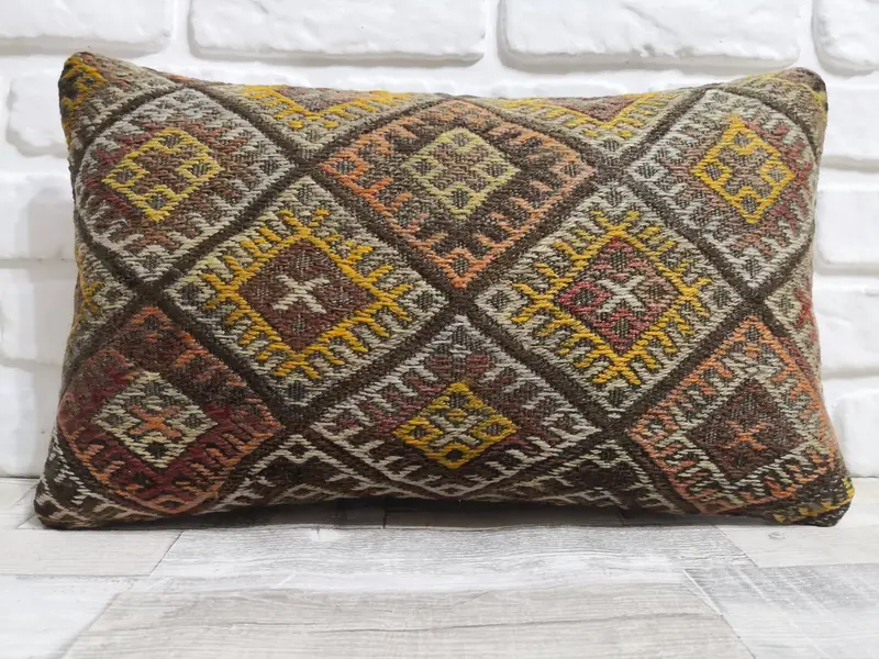 Handgefertigtes Wollkissen, geometrisches braunes Rechteckkissen