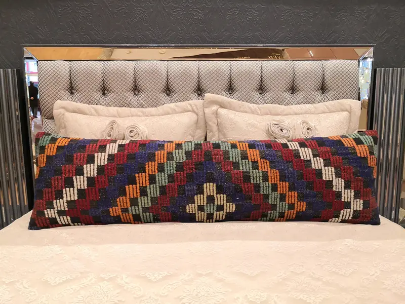 Handgefertigtes blaues und rotes geometrisches Wollkissen, Vintage-Rechteckkissen