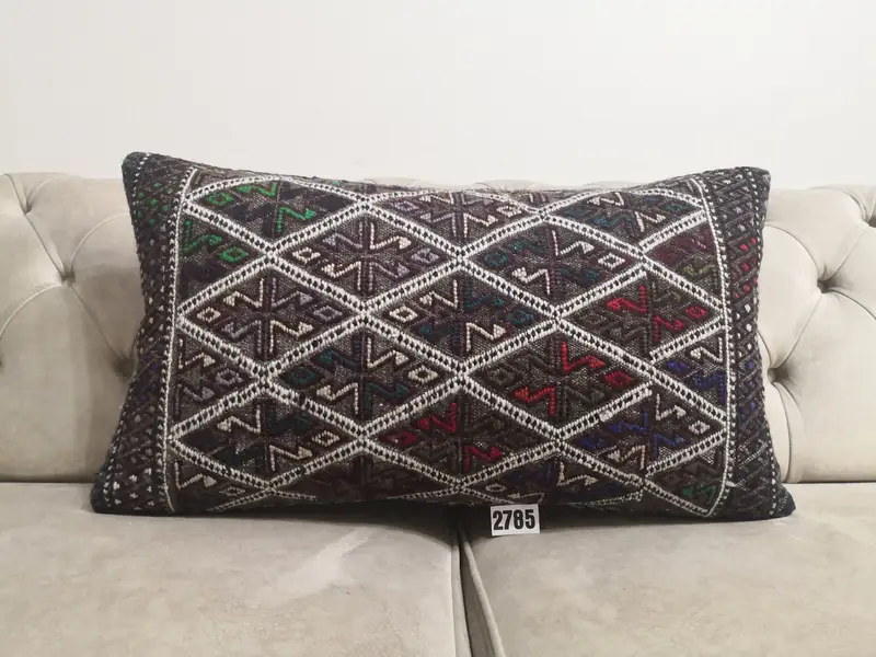 Handgefertigtes blaues und graues geometrisches Wollkissen, Vintage-Rechteckkissen