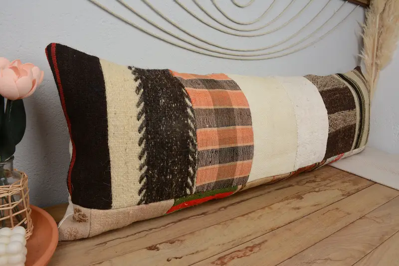 Handgefertigtes 16x48 weißes und braunes Patchwork-Wurfkissen, Vintage-Kissen