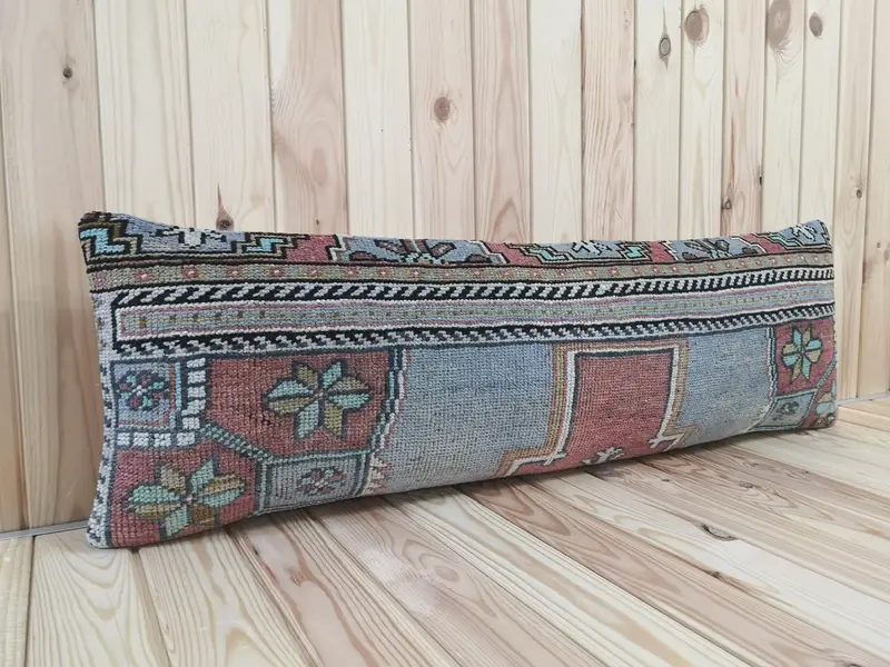 Handgefertigtes blaues und rosa geometrisches Wollkissen, Vintage-Rechteckkissen