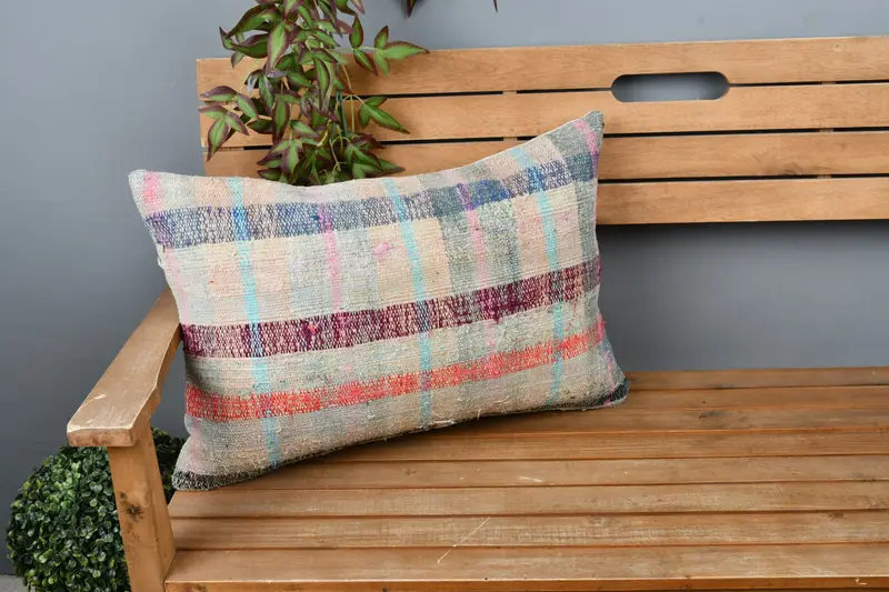 Beige & rot gestreiftes Kissen, handgefertigtes besticktes Kissen