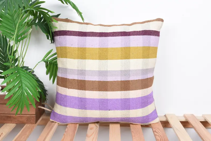 Lila & Beige gestreiftes Kissen, besticktes Vintage Kissen