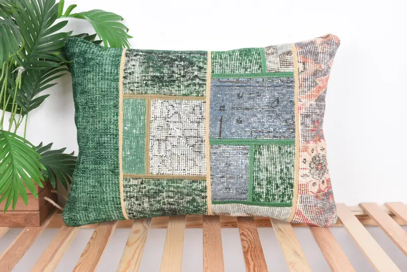 Grünes Leinen-Wurfkissen, 20x28 besticktes Patchwork-Kissen