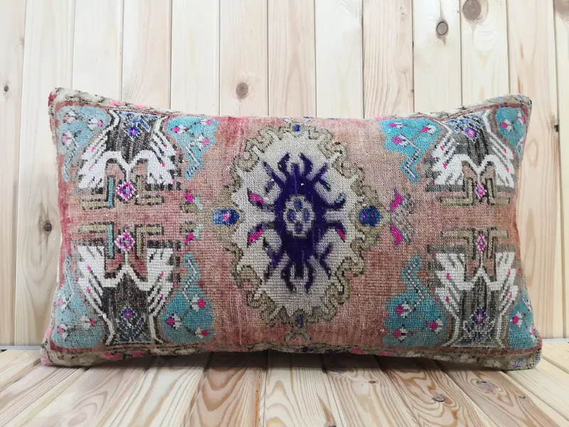 Handgefertigtes rechteckiges Kissen in Roségold, geometrisches Wollkissen