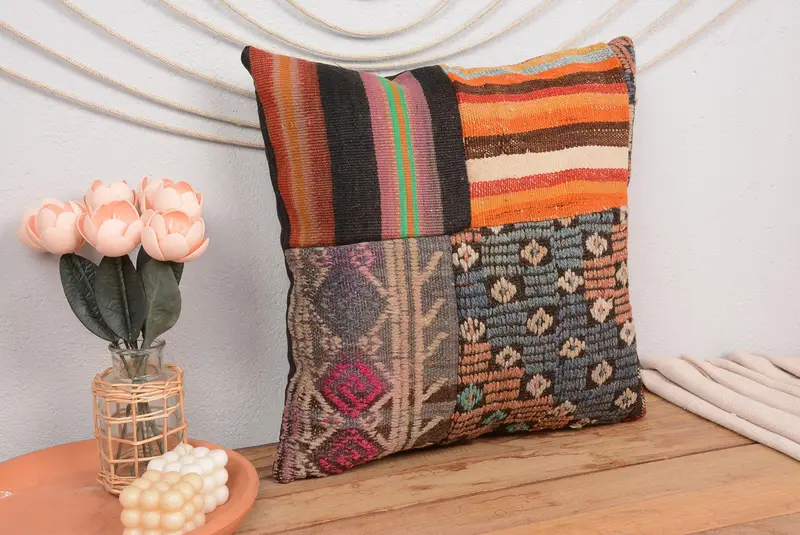 Orange & grünes Patchwork-Wurfkissen, handgemachtes Vintage-Kissen