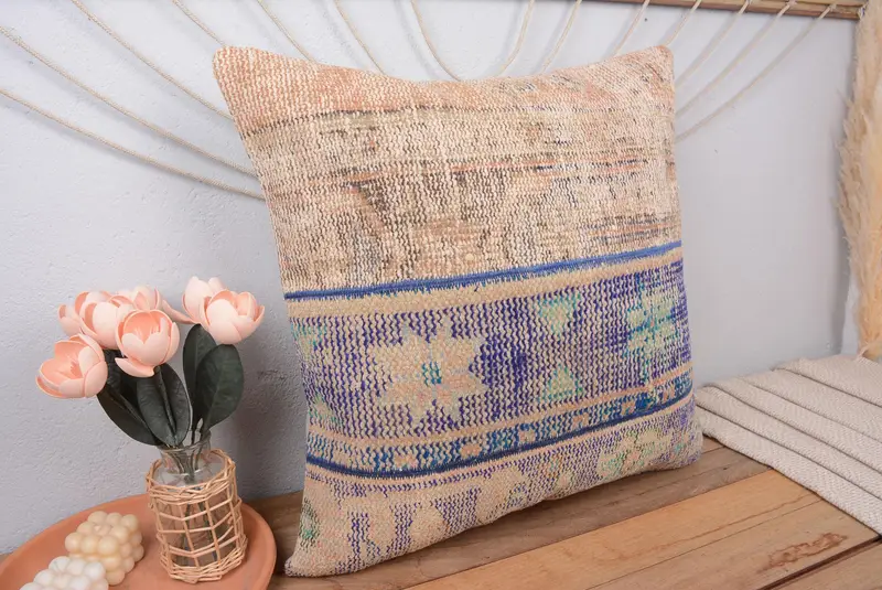 Besticktes blaues und braunes Patchwork-Wurfkissen, handgefertigtes Vintage-Kissen