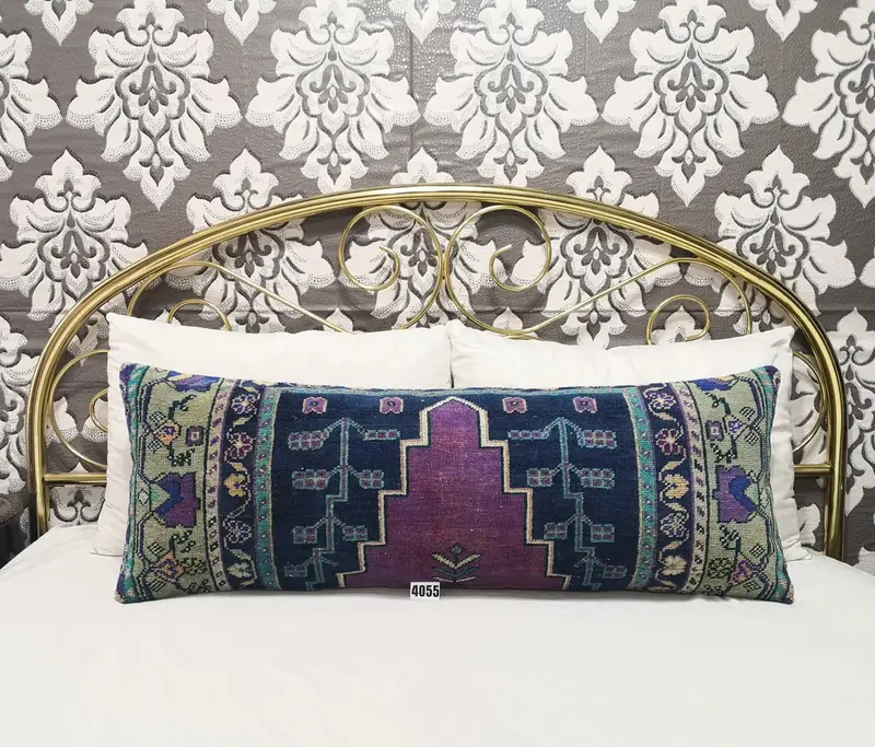 Besticktes Wollkissen, geometrisches Bronze- und Lila-Rechteckkissen