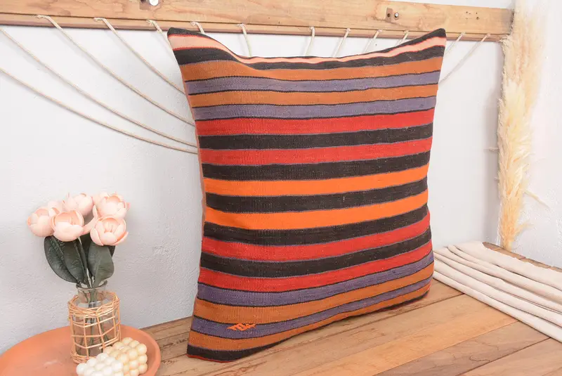 Rot & Orange gestreiftes Kissen, handgefertigtes besticktes Kissen