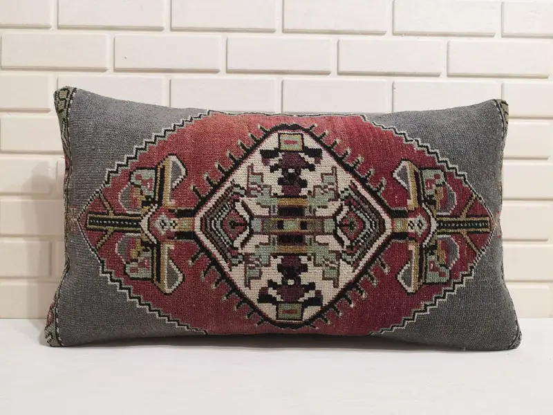 Handgefertigtes besticktes Wollkissen, geometrisches Kissen in Rot und Grau