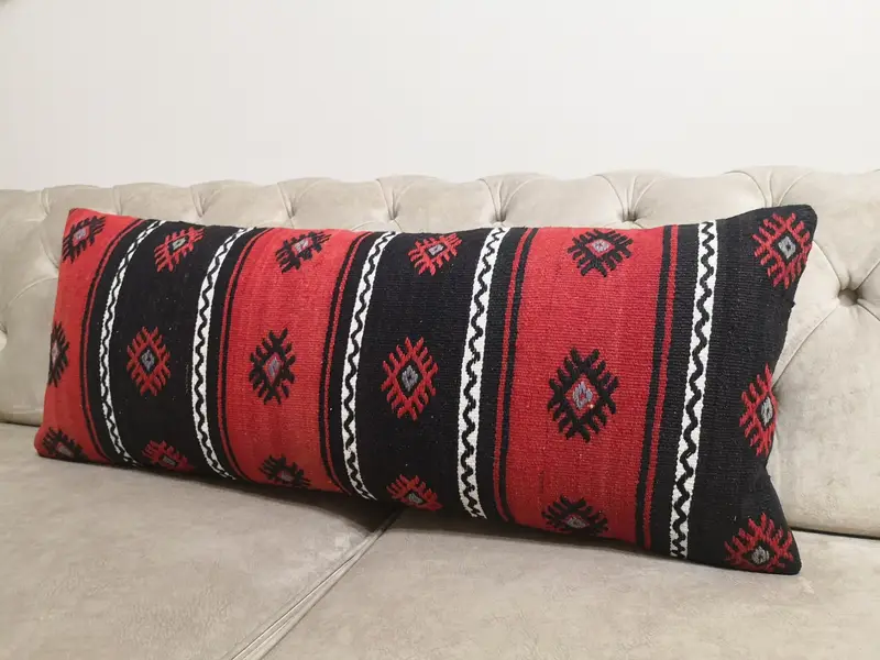 Rechteckiges rot-schwarz gestreiftes Wollkissen, handgefertigtes Kissen