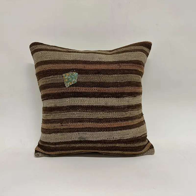 Beige & braun gestreiftes Wurfkissen, besticktes Vintage-Kissen