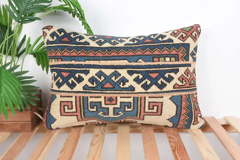 Blaues und beiges Leinen-Wurfkissen, 16 x 24 besticktes Kissen, Patchwork-Design