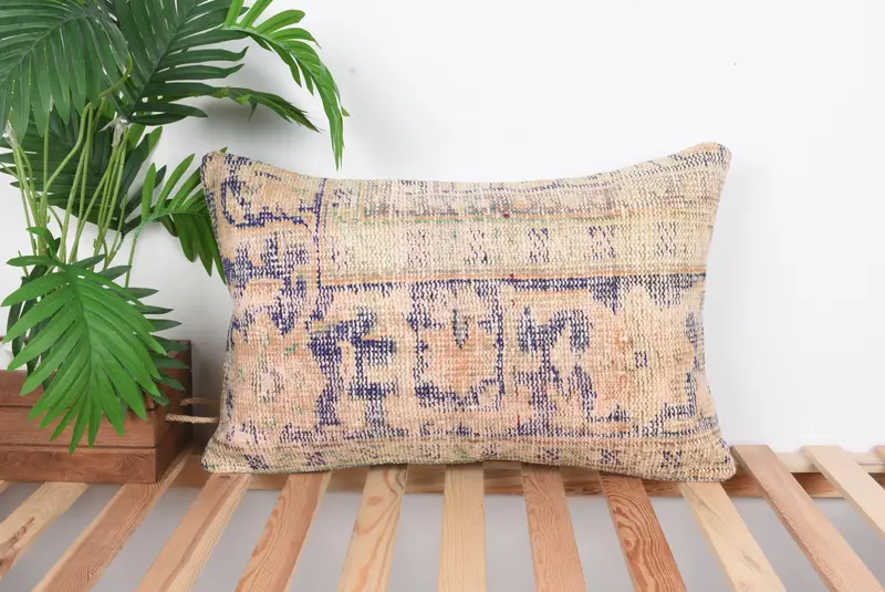 Blau & Beige besticktes Wurfkissen, 16x24 handgemachtes Kissen