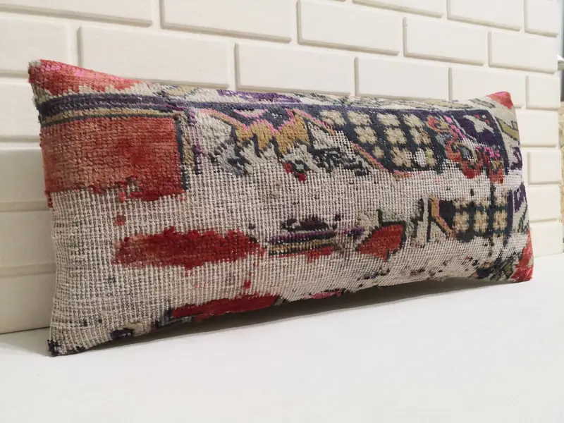 Handgefertigtes Wollkissen, geometrisches Rechteckkissen in Rot und Bronze